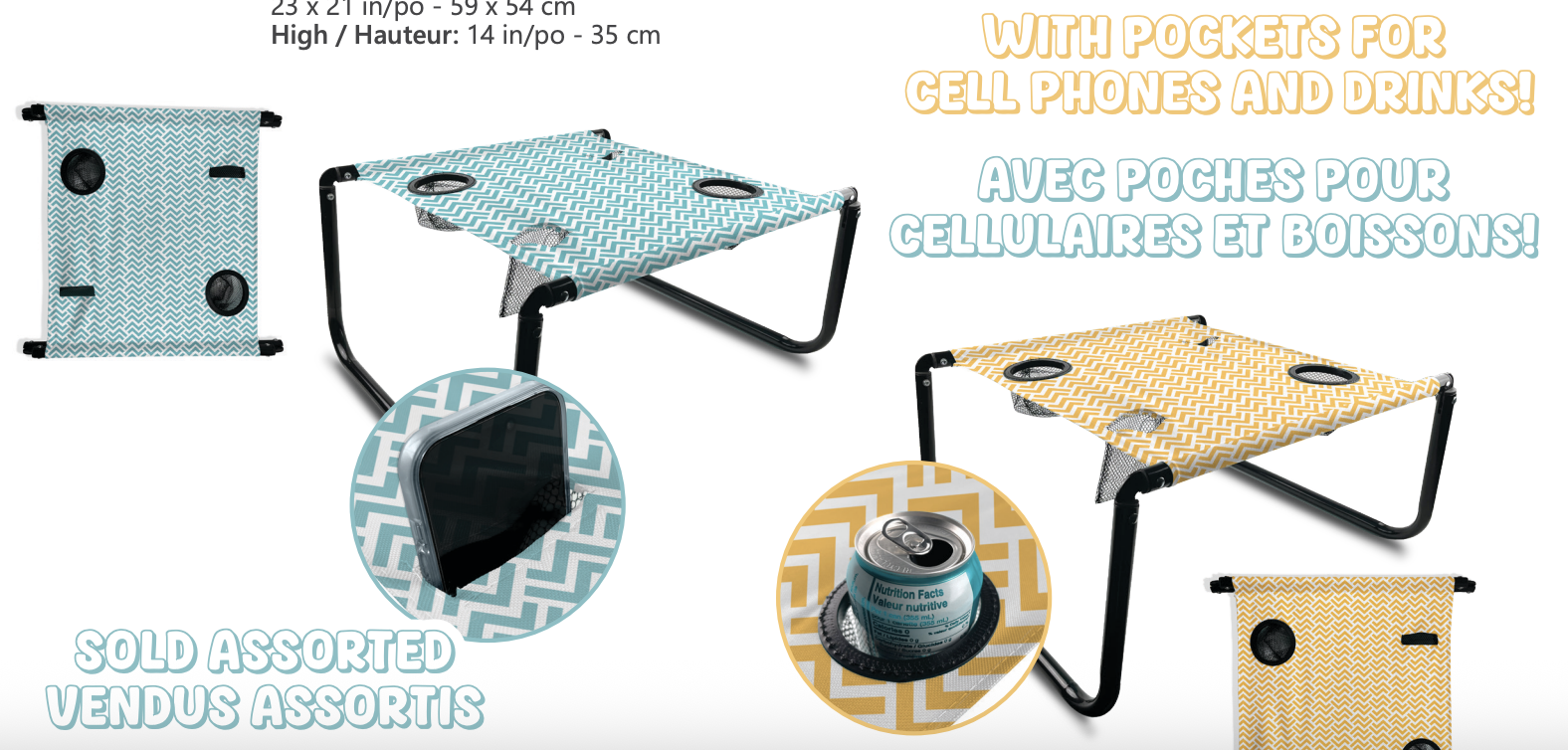 Beach Foldable Table with Pockets for Cell Phone & Drinks ~ 23″ x 21″ (21″ high)